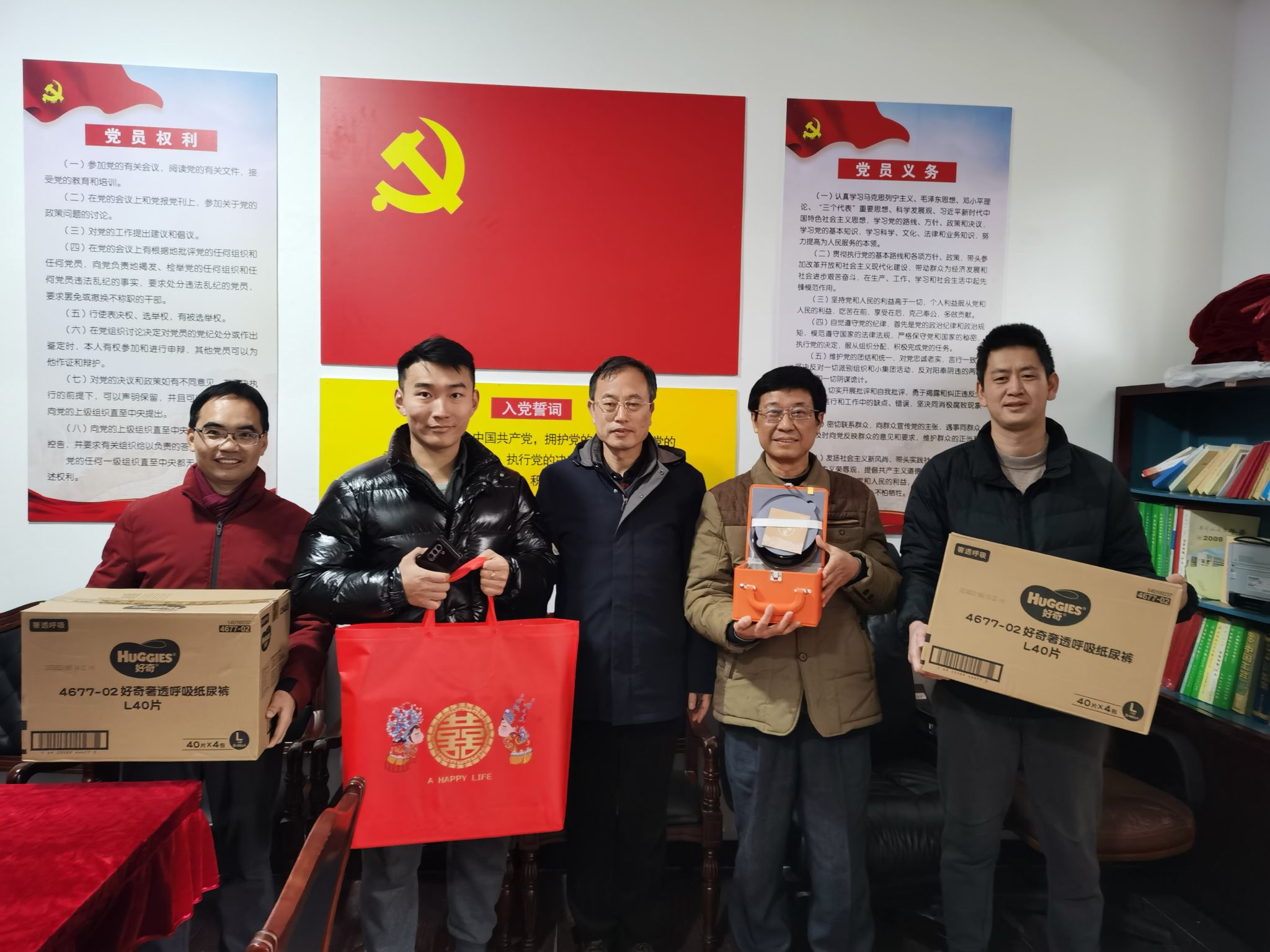 2月29日下午,在工会会议室,我校工会首次为符合政策生育、结婚和离退休人员颁发纪念品,校工会主席张霭云对前来领取纪念品的有关教职工表示了慰问,为他们送上了美好祝福并与之合影留念。