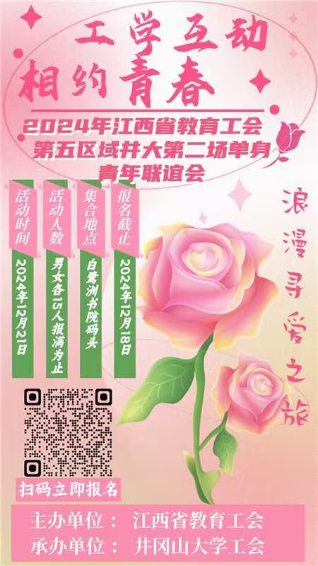 近日,为积极响应江西省总工会、江西省教育工会关于促进青年交友的号召,井冈山大学工会于2024年12月21日再次成功举办了第二场以“工学互动▪相约青春”为主题的青年联谊会活动。此次活动旨在满足未婚单身青年的交友需求,为他们提供一个沟通交流的平台,帮助他们早日实现脱单。