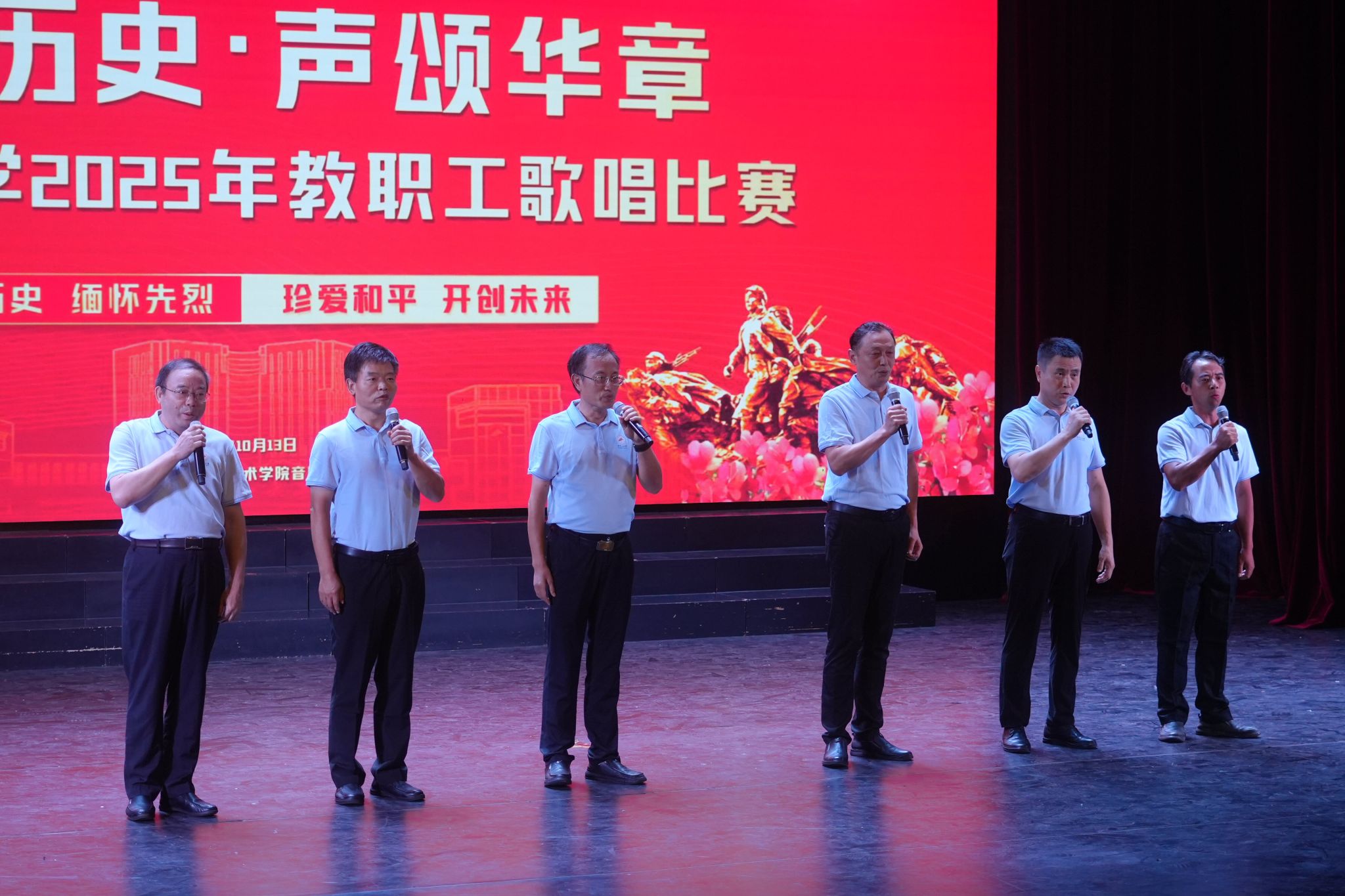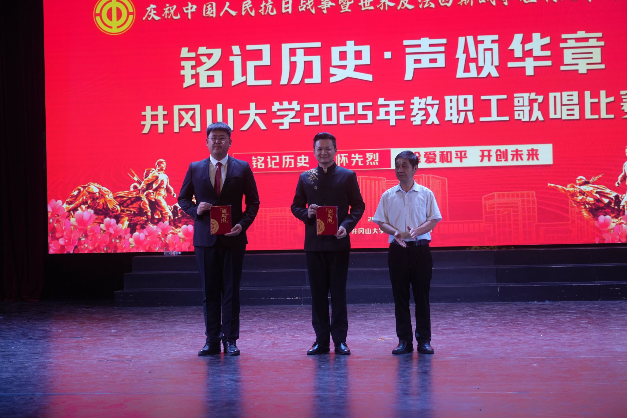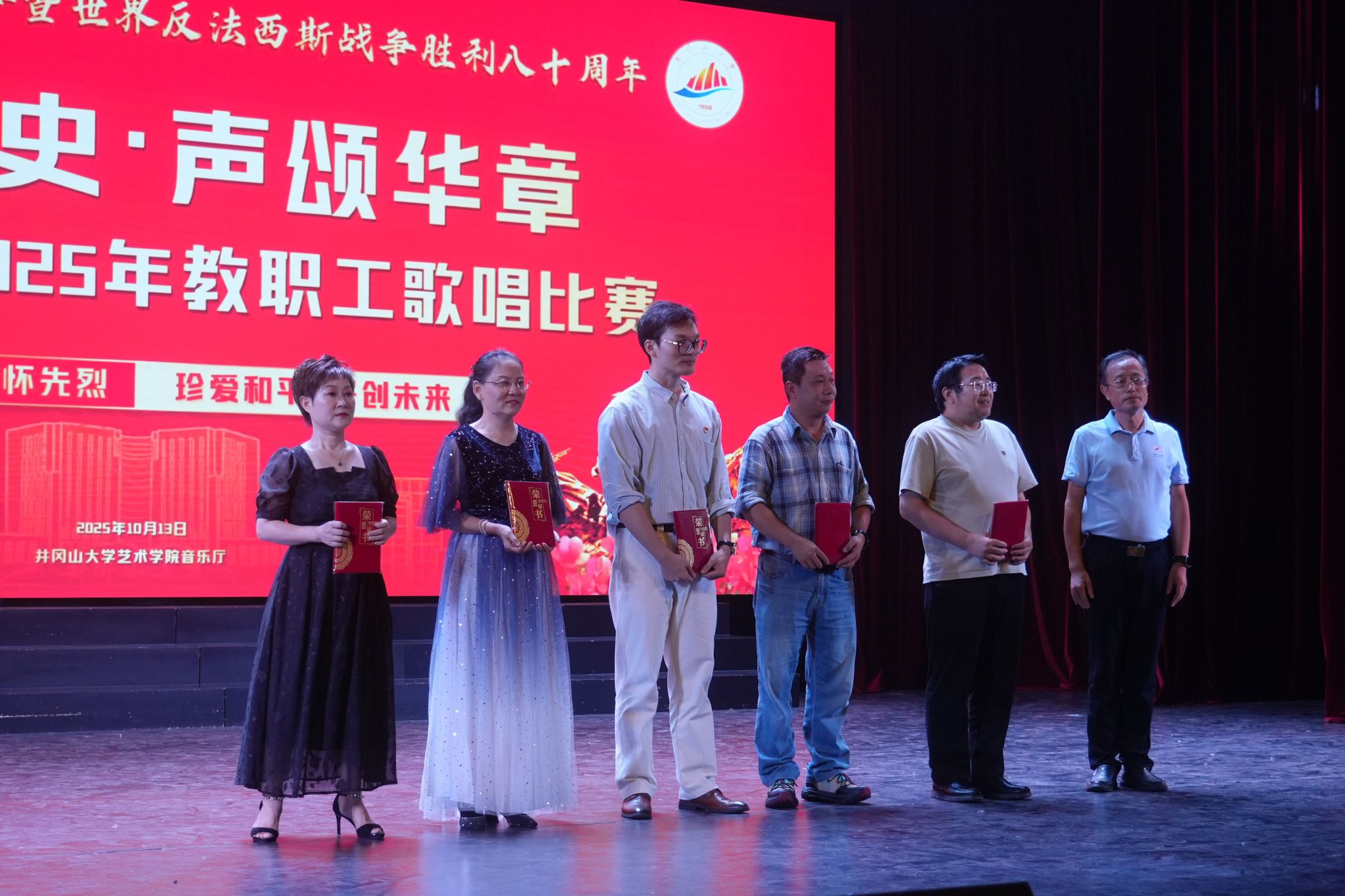 为纪念中国人民抗日战争暨世界反法西斯战争胜利八十周年,井冈山大学校工会于10月13日晚7点在艺术学院音乐厅举办“铭记历史 声颂华章”2025年教职工歌唱比赛。校党委常委、纪委书记彭西洪莅临现场指导并为获奖教职工颁奖。来自全校各分工会的近三百名师生参与了本次活动,70多位教职工一展歌喉,讴歌那段刻骨铭心的历史,礼赞我们伟大的党和祖国,大力激发师生弘扬爱国主义情怀。