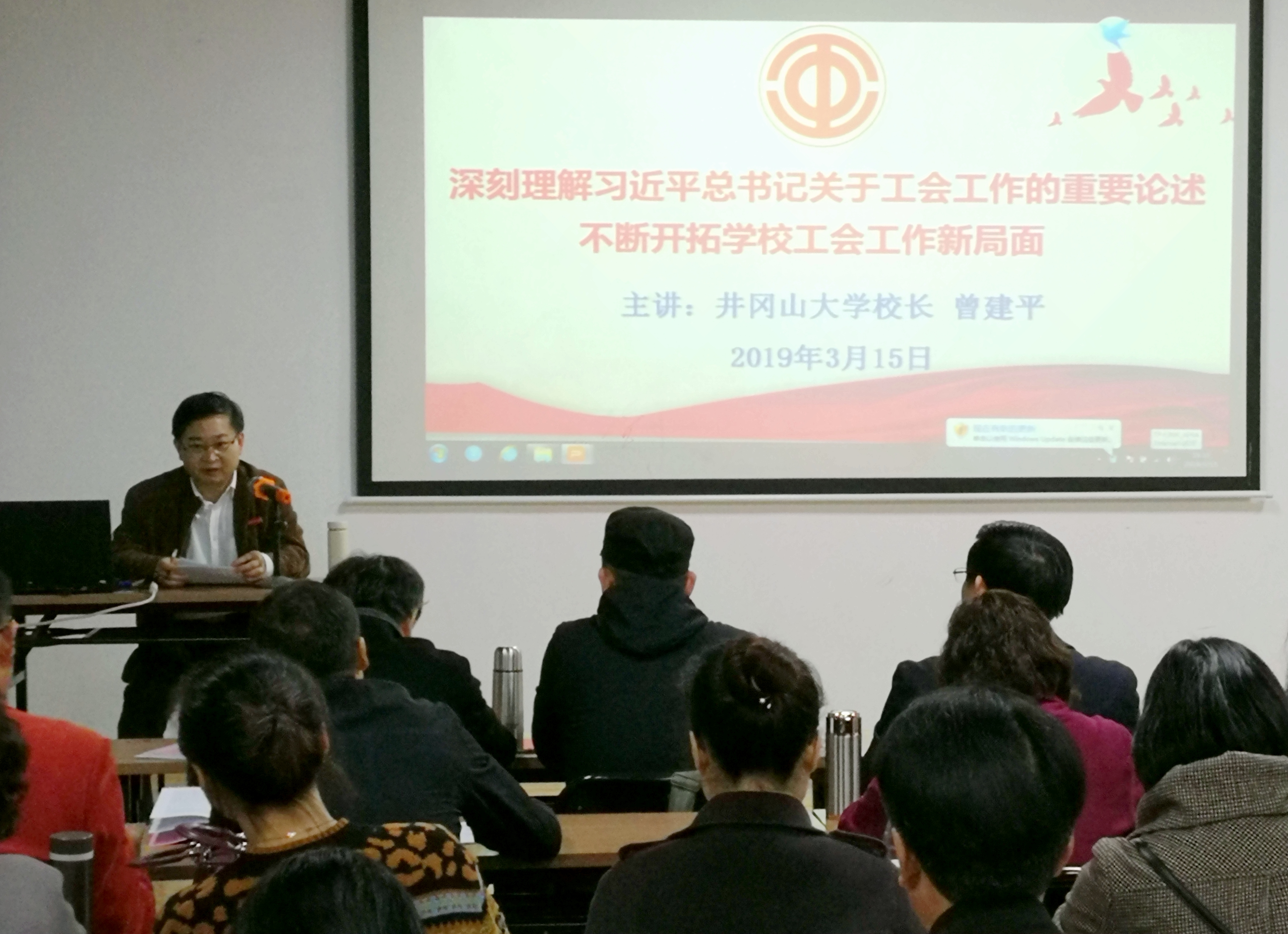 3月15日至17日,我校工会干部习近平新时代中国特色社会主义思想学习会暨三届三次委员(扩大)会议在井冈山红色拓展训练基地举行。校党委副书记、校长曾建平作了《深刻理解习近平总书记关于工会工作的重要论述,不断开拓学校工会工作新局面》宣讲报告。校工会三届委员会委员、经审委员、提案委员、女工委员和部分基层工会负责人共计34人参加了会议。 曾建平结合自己对习近平总书记关于工会工作的重要论述的学习体会,作了一个系统全面、准确精彩的宣讲报告。报告从深刻理解习近平总书记关于工会工作重要论述的丰富内涵、习近平总书记关于工会工作的重要论述是对马克思主义工运理论的新发展、把握工会组织的新使命新担当、把握高校工会特点积极推动学校工会工作等四个方面,进行了系统深入讲解。