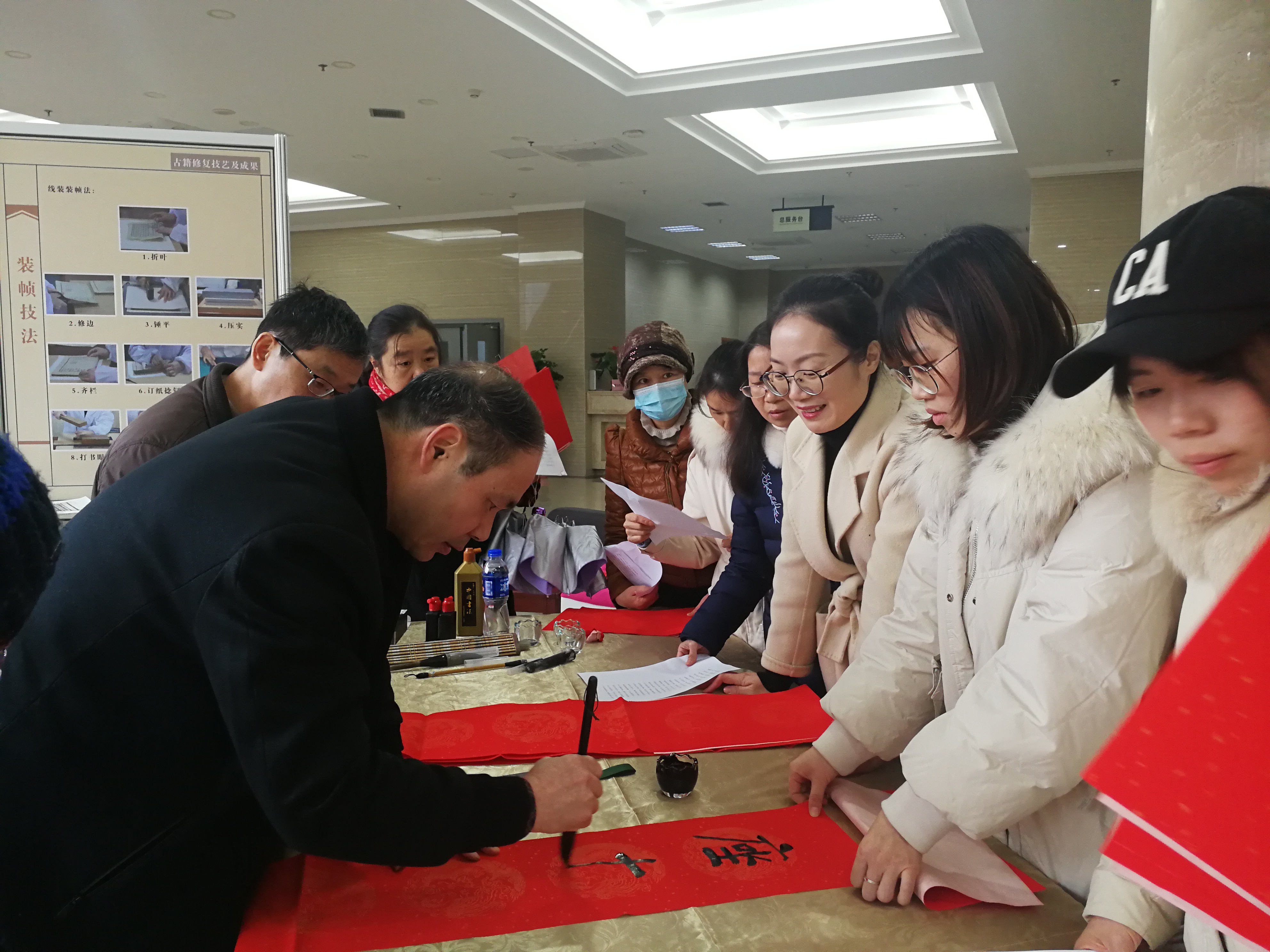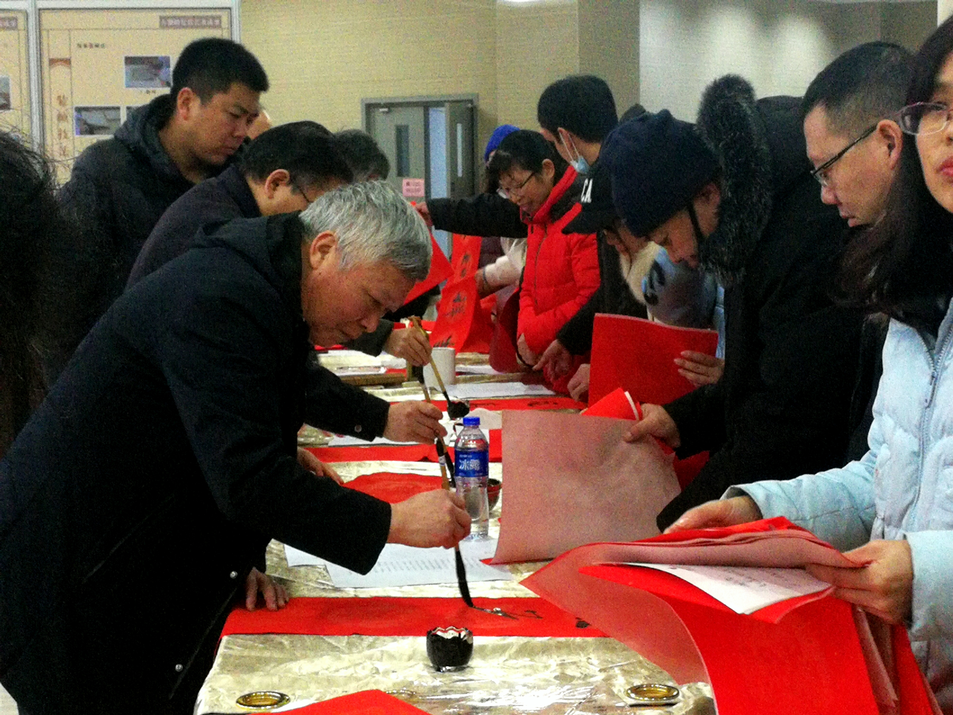 活动从下午2点半一直持续到5点多,学校不少教职工慕名而来,兴高采烈地围着各位书法家精心书写寄托新年祝福和期盼的春联,整个大厅喜气洋洋、翰墨飘香、热热闹闹,在各位书法家龙飞凤舞、虎虎生威的笔墨下,一幅幅写满祝福和美好心愿的对联映入眼帘。几个书法家经过三个多小时不顾疲倦、一刻不停地书写了三百多副春联和福字,让前来观摩的教职工一个个满意地领着充满寄托的春联兴致而归。为开展好此次活动,校工会还开展了“有奖春联征集活动”,十对获奖对联在现场被前来观摩的教职工争相选领。
